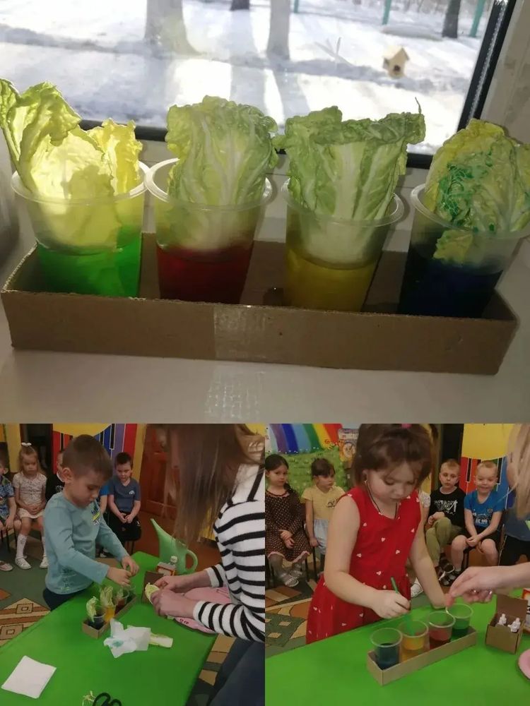 А ещё с сюрпризом к ребятам приходила мама Вылегжаниной Веры. Дети месте с Ириной Андреевной запускали цветные вулканы из жерла пластикового вулкана. А ещё они убедились в том, что растениям необходима вода. Листья салата так активно ее пили, что окрасились в цвета жидкости, в которую их поставили юные исследователи.