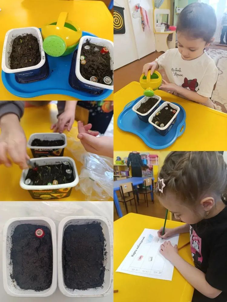 Посадив семена салата в ёмкости с чистой землёй и землёй, где закопаны батарейки, убедились, что растения не могут жить в загрязнённой почве.